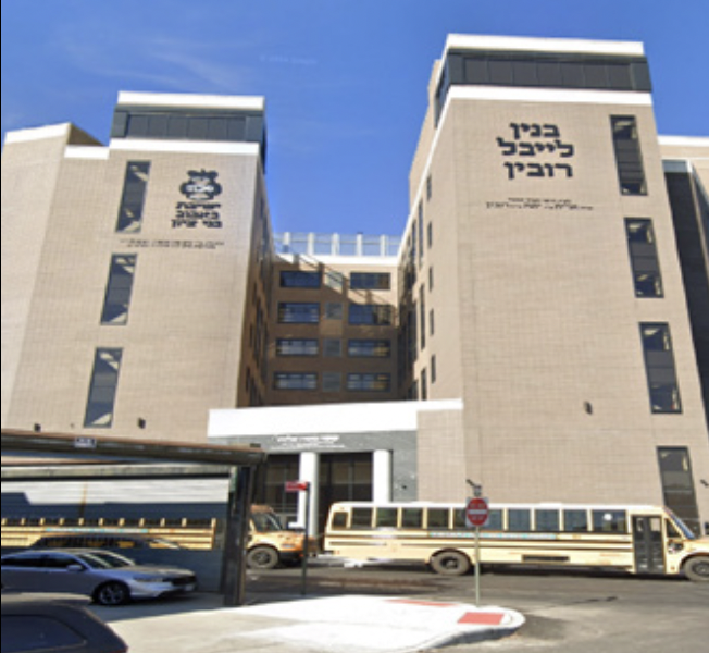 A prominent institutional lobby serving the Bobov Yeshiva campus in Borough Park, Brooklyn, designed as a highly durable and visually cohesive public interior accommodating heavy daily use.